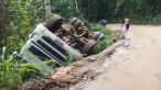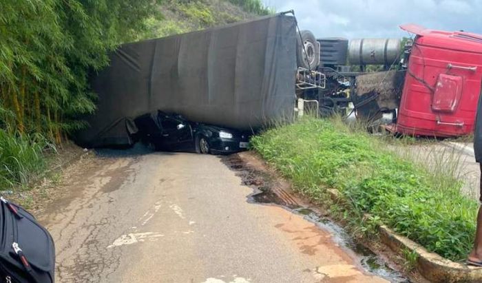 Mulher morre após carreta carregada com minério tombar e esmagar carro na BR-262.