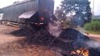 Carreta carregada de carvão vegetal pega fogo na BR 116