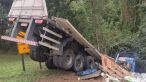 Carreta tomba na BR-116 e derrama 29 toneladas de fertilizante em ribanceira