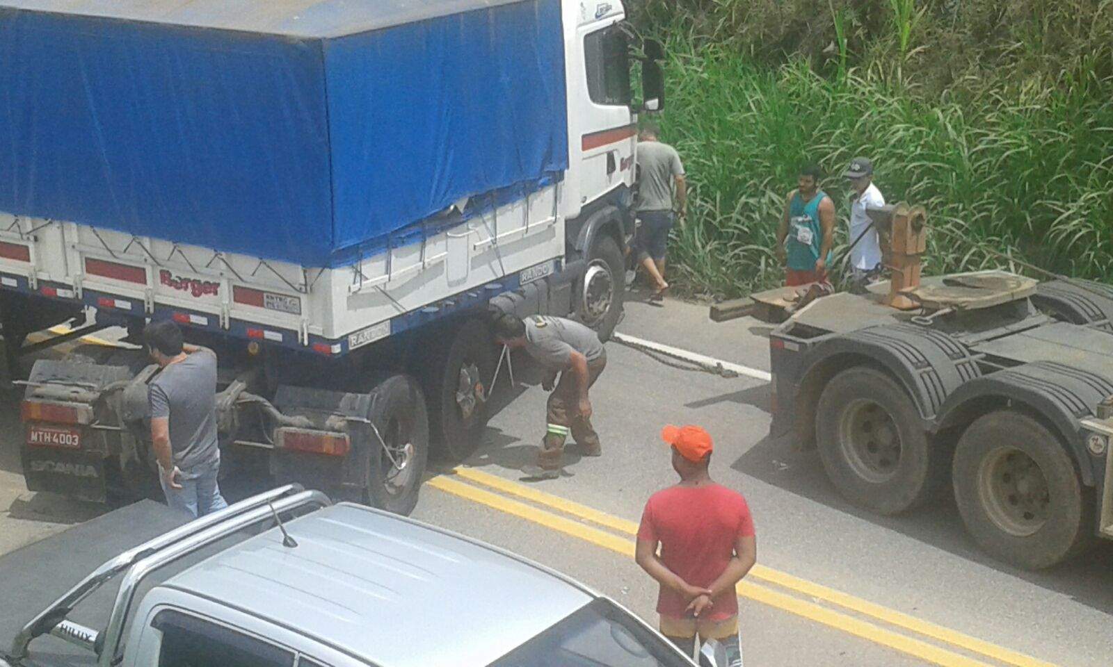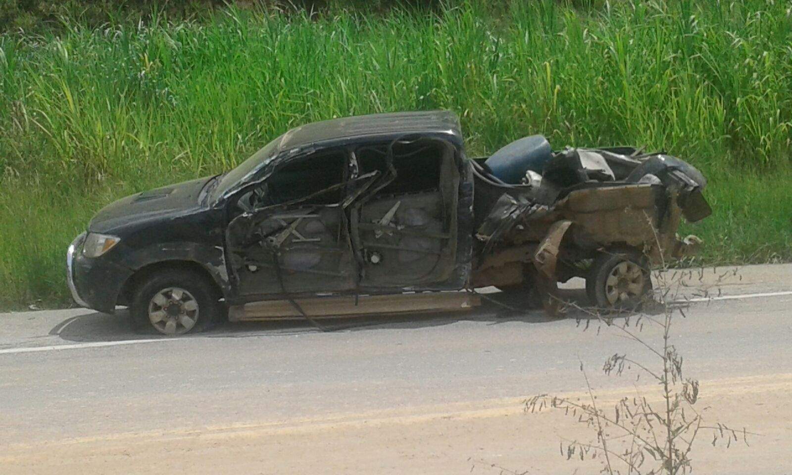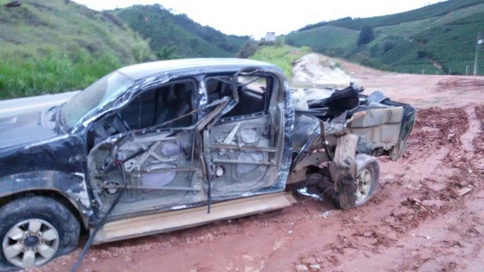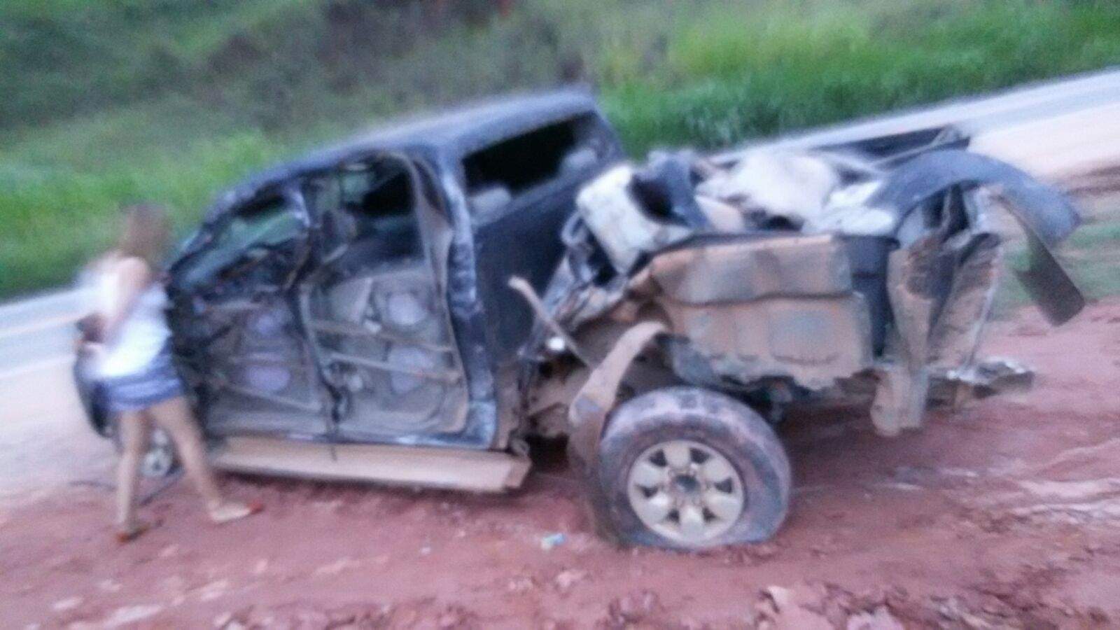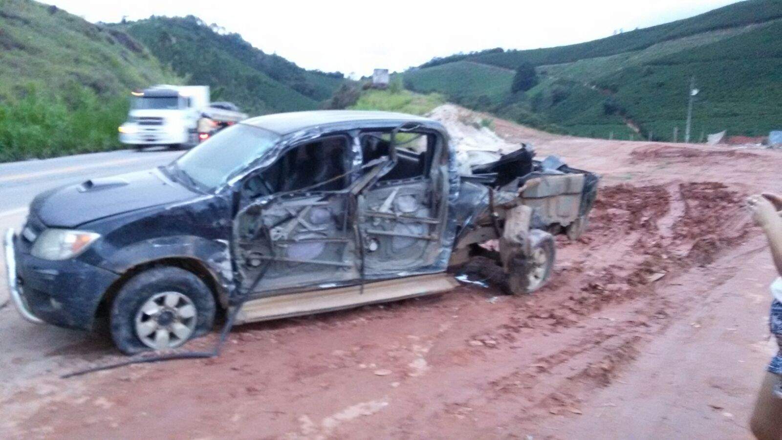 A colisão foi entre uma Hilux Preta e uma carreta. O carro atingiu a lateral do outro veículo.