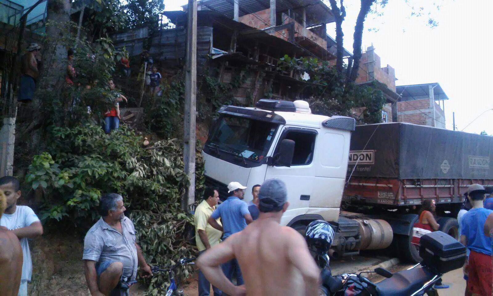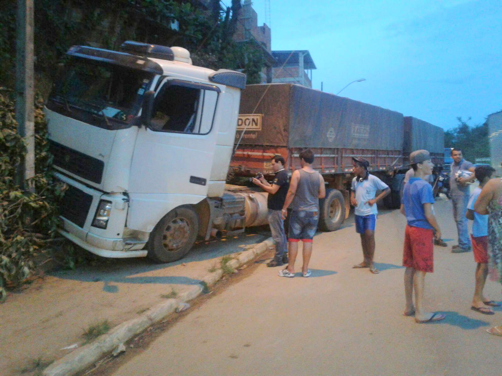 A carreta parou sobre o trecho da pista da ciclovia e atingiu um poste e o barranco. Felizmente ninguém caminhava no trecho no momento.