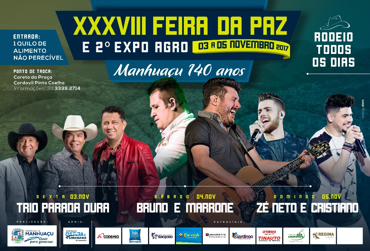 A 38ª Feira da Paz é na próxima semana. No dia 3 de Novembro – show com Trio Parada Dura. No sábado, se apresenta a dupla sertaneja Bruno & Marrone, e, no domingo, a animação fica por conta de Zé Neto & Cristiano. Haverá rodeio, barracas e parque de diversões todas as noites.
