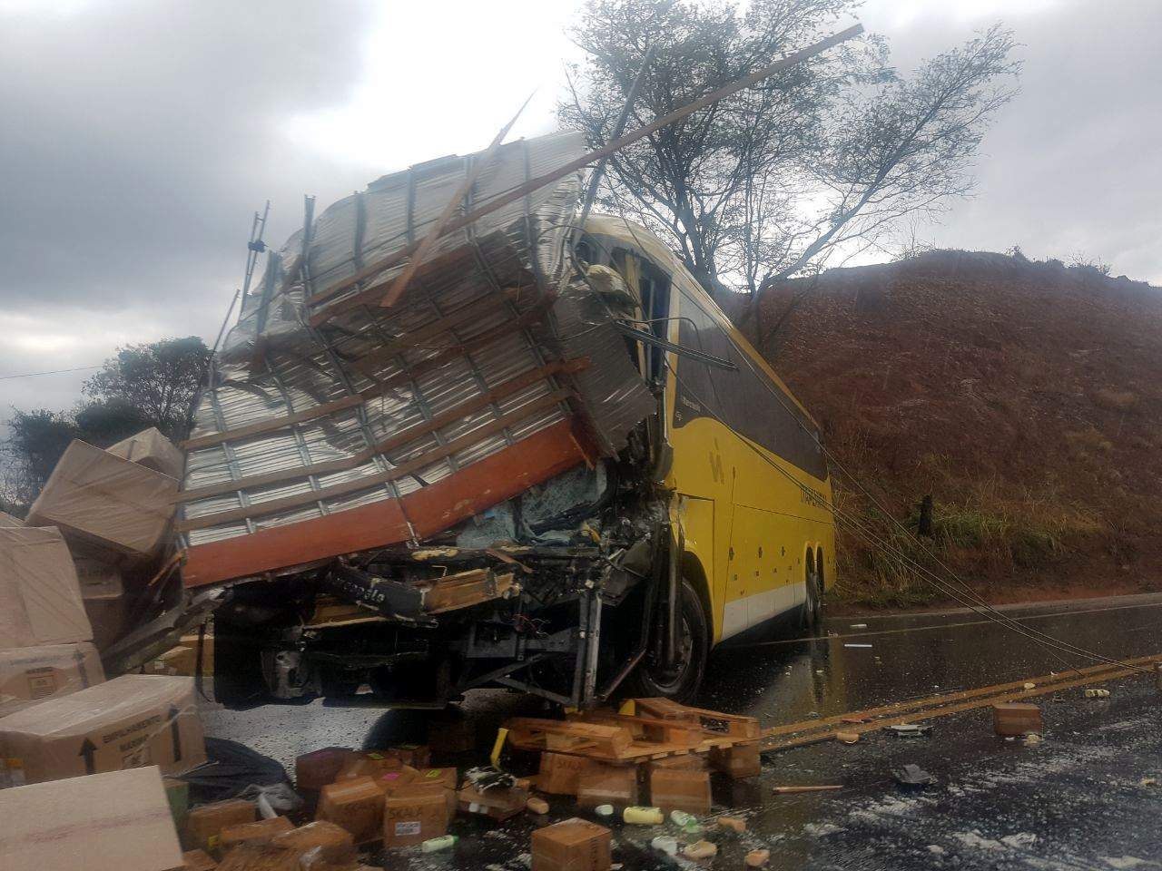 SANTA BÁRBARA DO LESTE (MG) - Colisão entre duas carretas e um ônibus da Viação Itapemirim, próximo a Santa Bárbara do Leste, neste domingo, 29/10, no km 554 da BR-116.