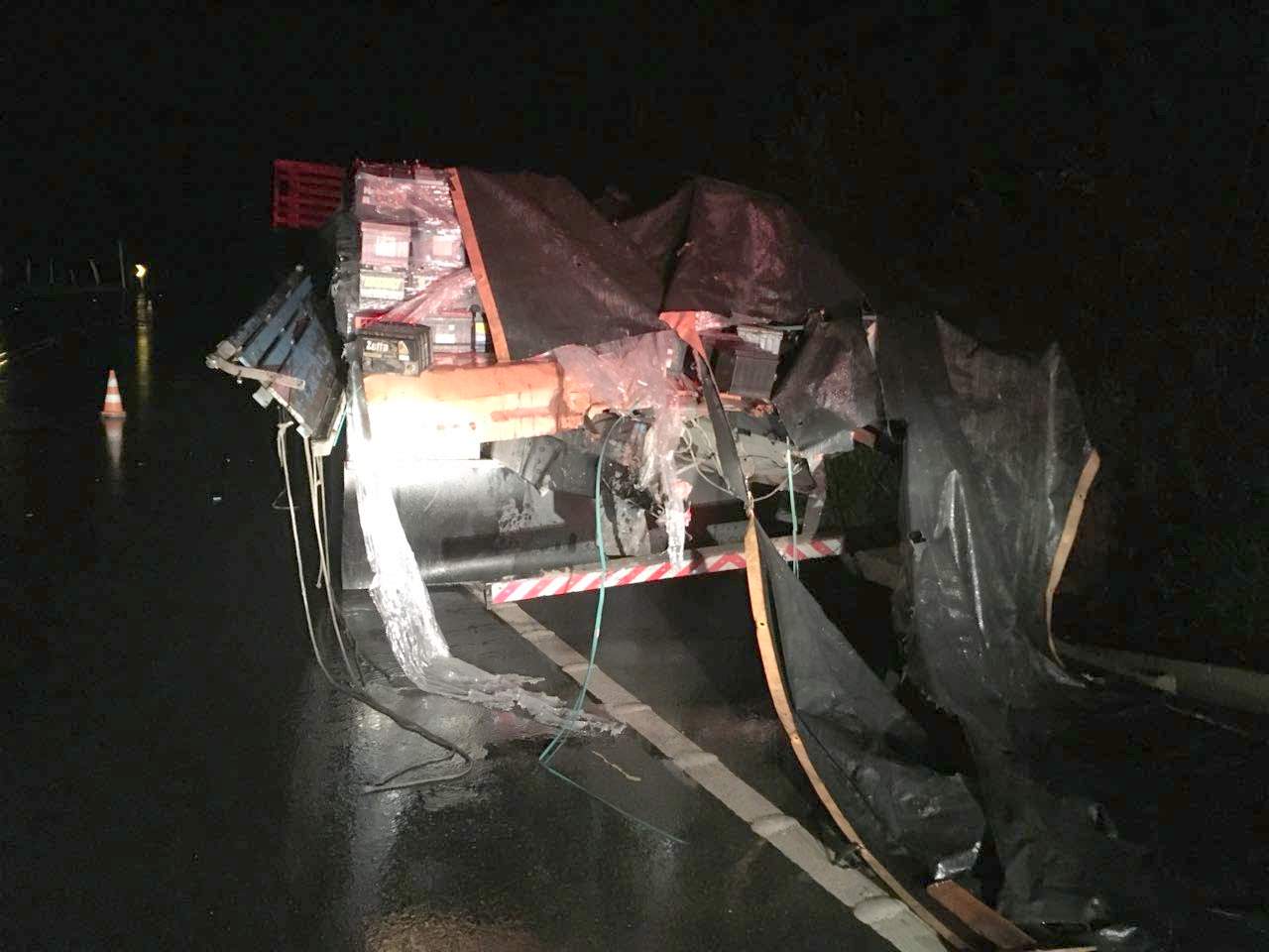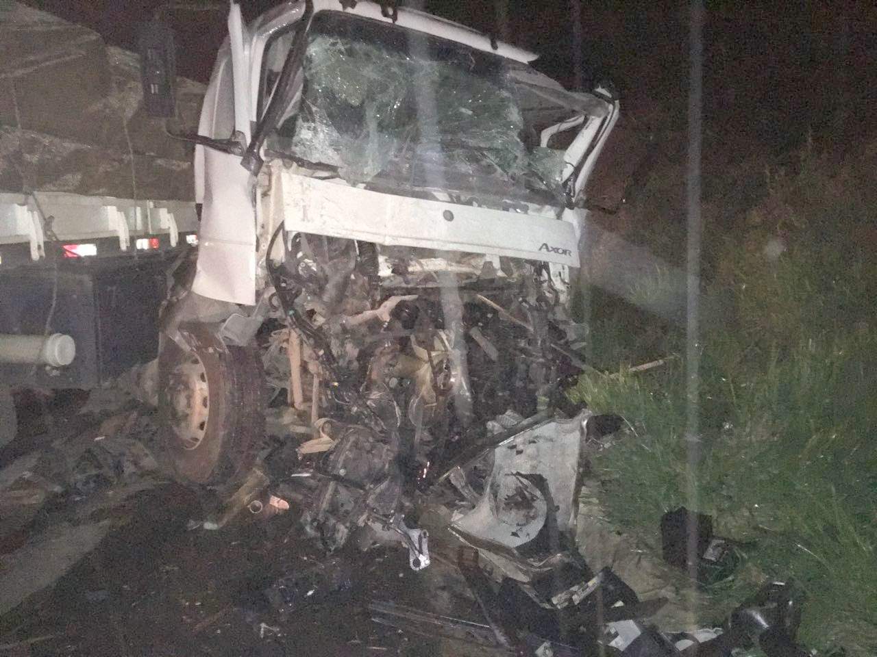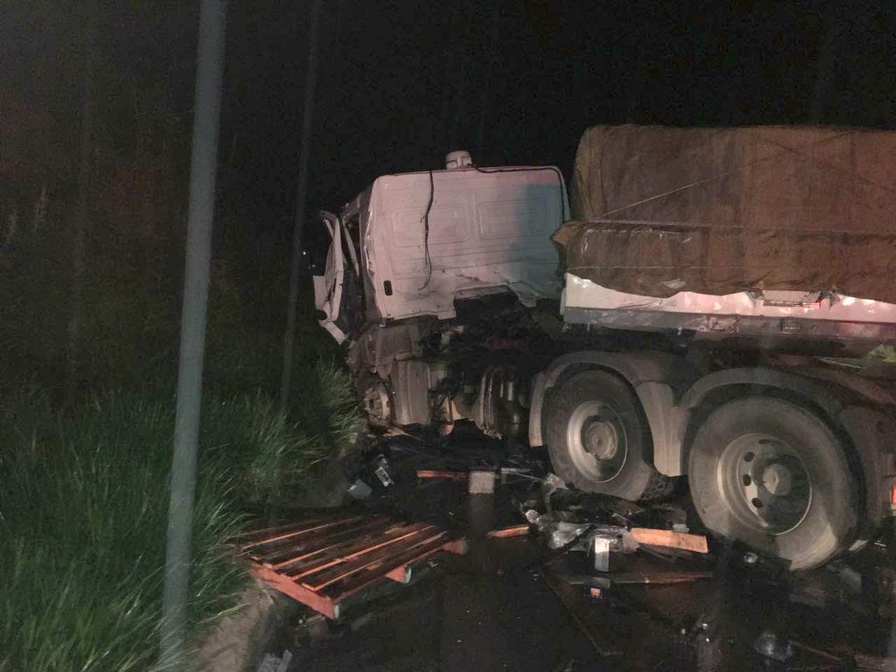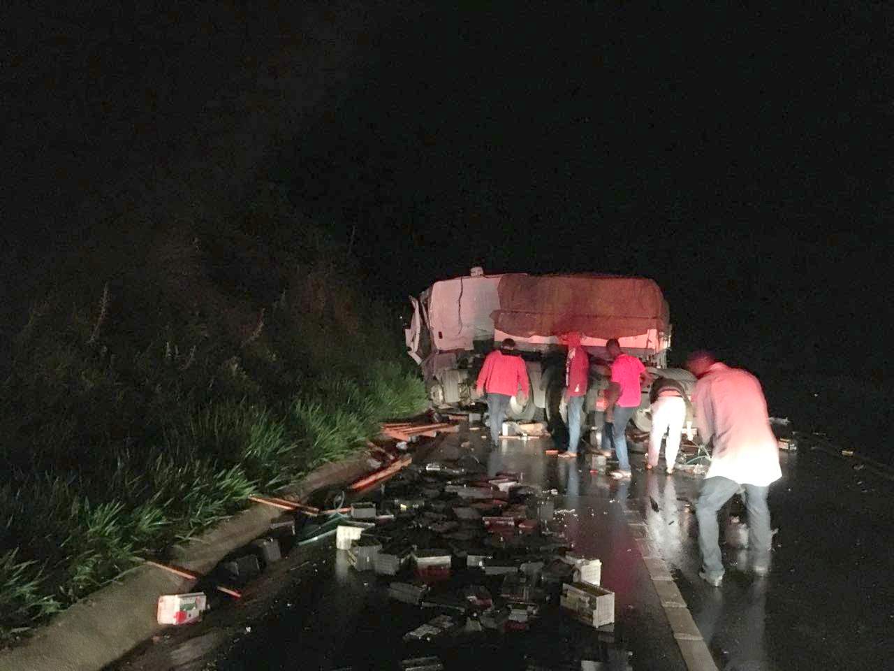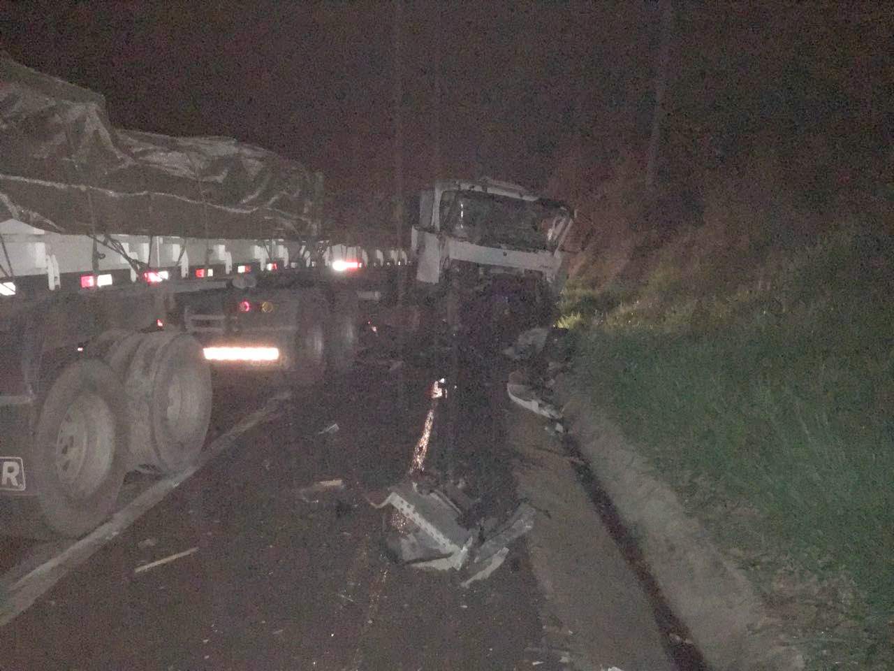 Num quebra-molas no km 596 da BR-166, a carreta colidiu com a traseira do caminhão que estava carregado de baterias. Em seguida, a carreta fez um “L” na pista.