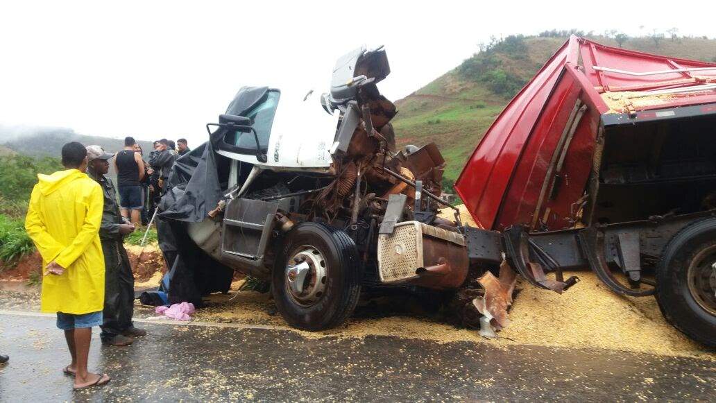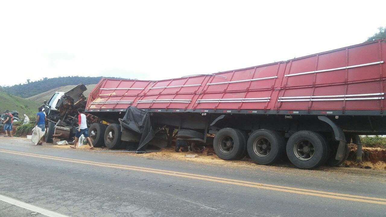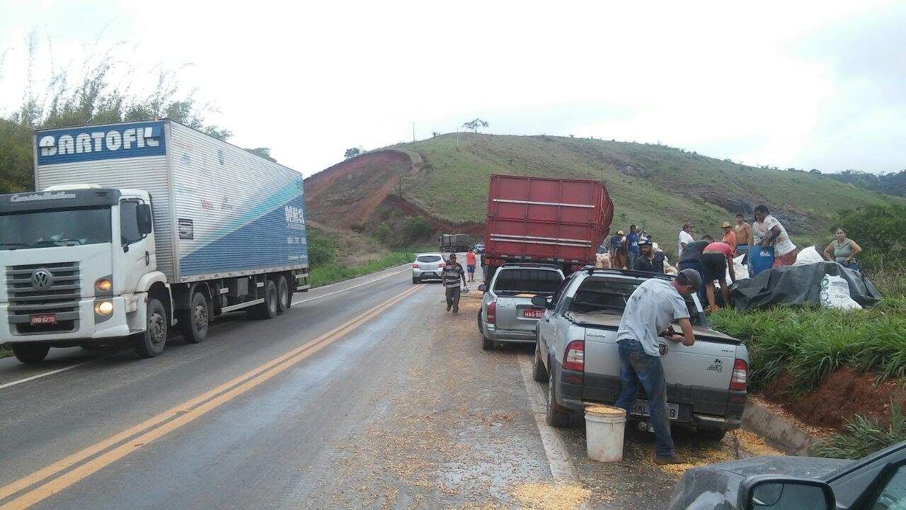Uma carreta transportando milho a granel apresentou problema nos freios e bateu na traseira de outra carreta, que estava logo à frente.