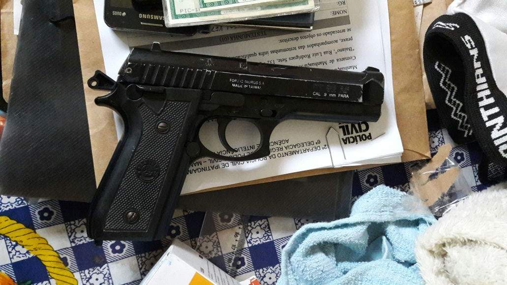 Durante as buscas, em uma mochila de criança localizada na área de serviço da residência, foram localizados uma imitação de arma de fogo, uma balança de precisão e uma sacola contendo recipientes para embalar drogas (pinos de plástico).