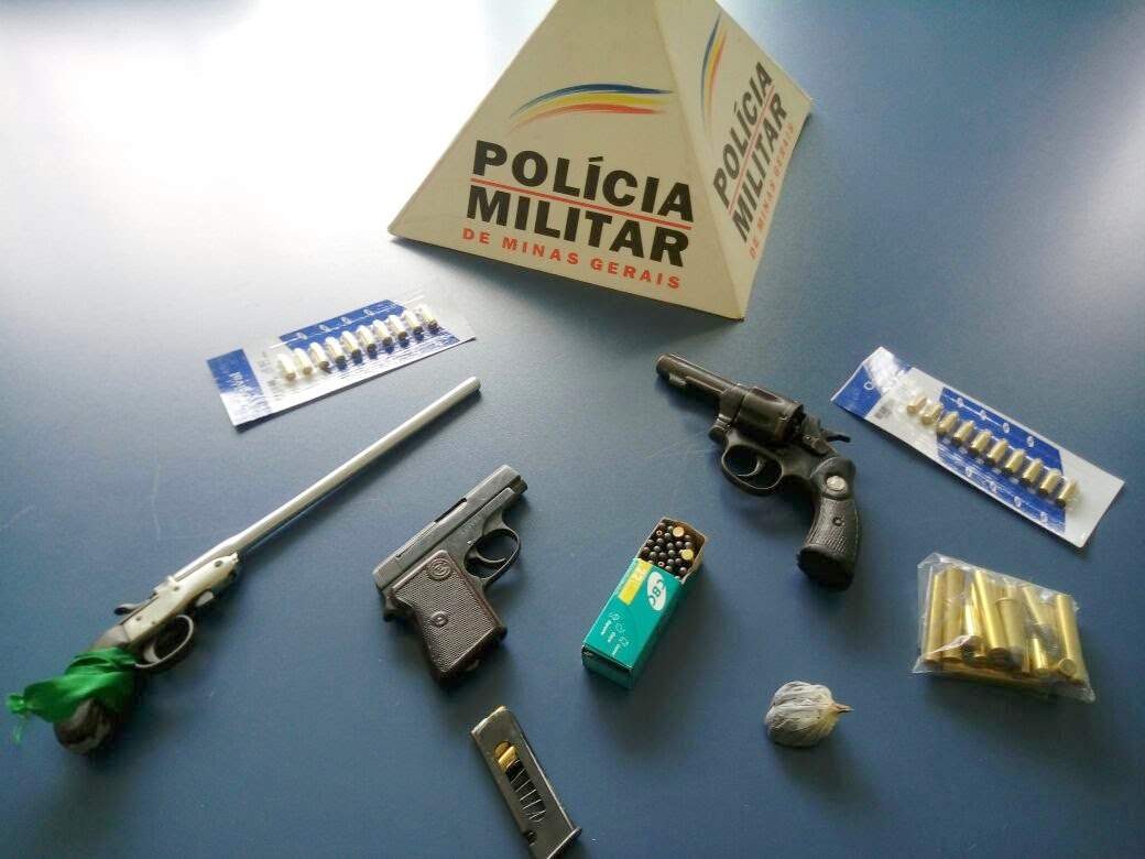 Militares apreenderam um revólver da marca Taurus, calibre .32, sem registro, municiado com três cartuchos intactos, em uma gaveta da cômoda em um dos quartos. Em continuidade às buscas, foi localizada uma garrucha da marca Rossi, calibre .22, sem registro, desmuniciada e ainda várias outras munições, sendo elas: 45 calibre .22; três calibre .38; oito calibre .32 e 24 calibre .25 (6.35mm).