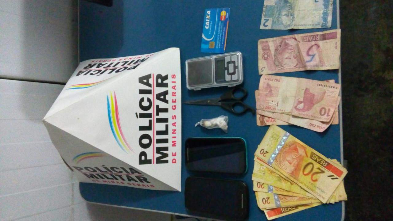 Os militares localizaram balança de precisão e dinheiro trocado em cédulas de 20, 10, 05 reais, totalizando 247 reais, além de outros materiais típicos da prática de tráfico de drogas, tais como tesoura e lâmina de barbear.