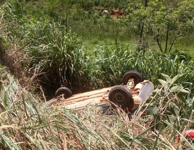 O carro saiu da estrada e desceu capotando por uma ribanceira até parar com as rodas para o alto.
