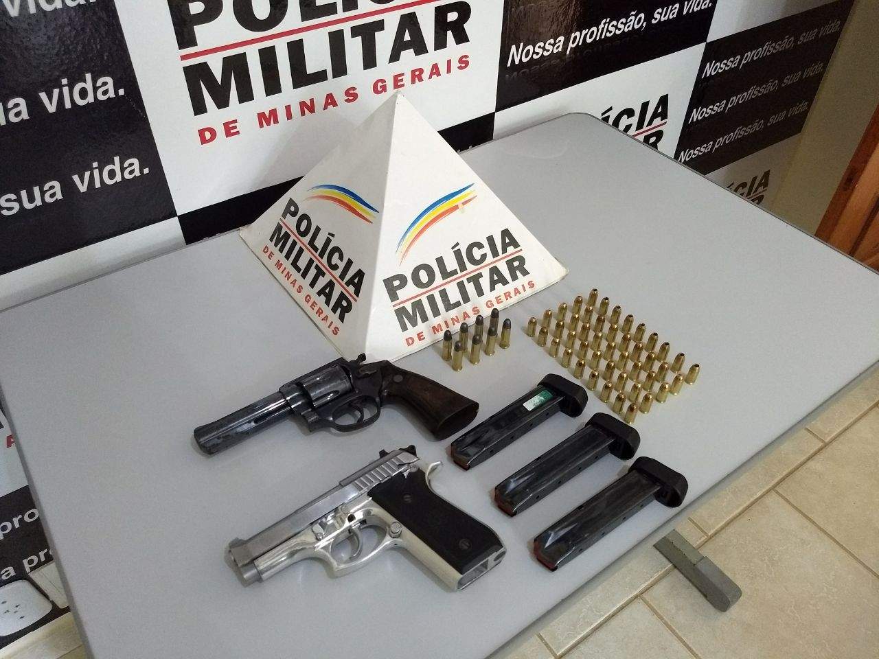 A equipe aprendeu; 01 Pistola Taurus cal .380, 01 Revólver cal .38, 47 munições cal .380, 10 munições cal .38, 03 carregadores de pistola.