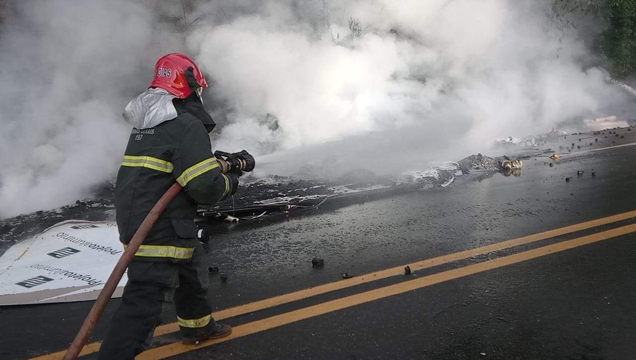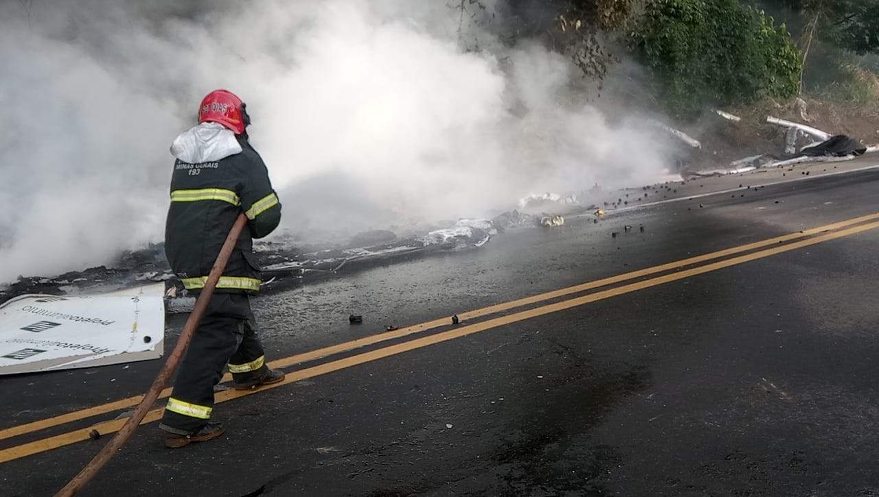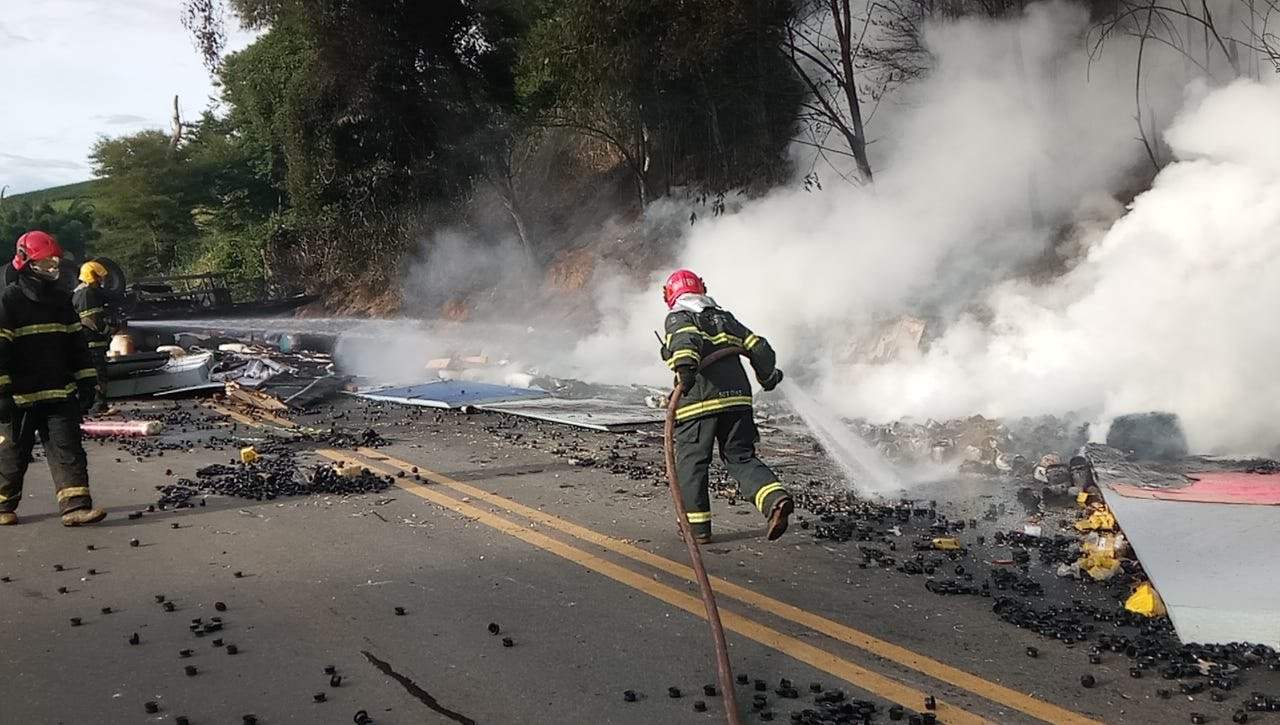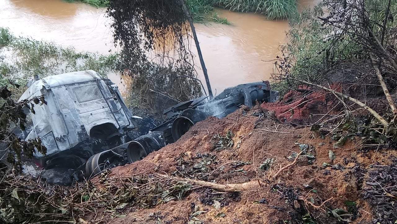 Após tombar na pista, o cavalo mecânico se desprendeu da carroceria e desceu por uma ribanceira, parando às margens de um córrego e também se incendiando. “Ao chegamos no local, constatamos que os dois ocupantes estavam orientados e conscientes, apenas com ferimentos leves. Eles foram levados para a Unidade de Pronto Atendimento de Manhuaçu, apenas com escoriações”, disse Sargento Eduardo Dias, do Corpo de Bombeiro Militar.