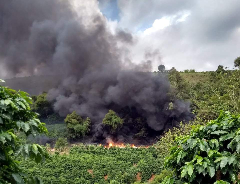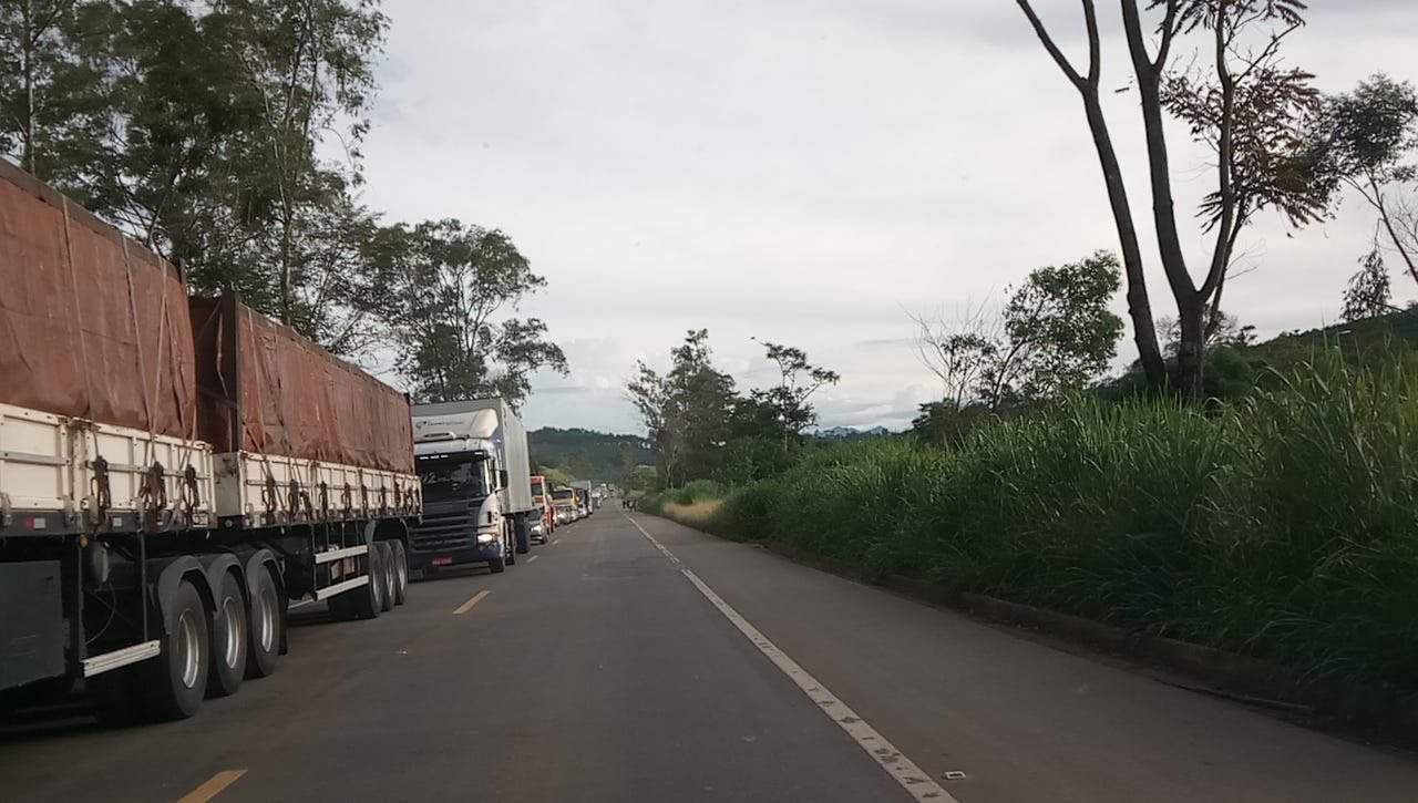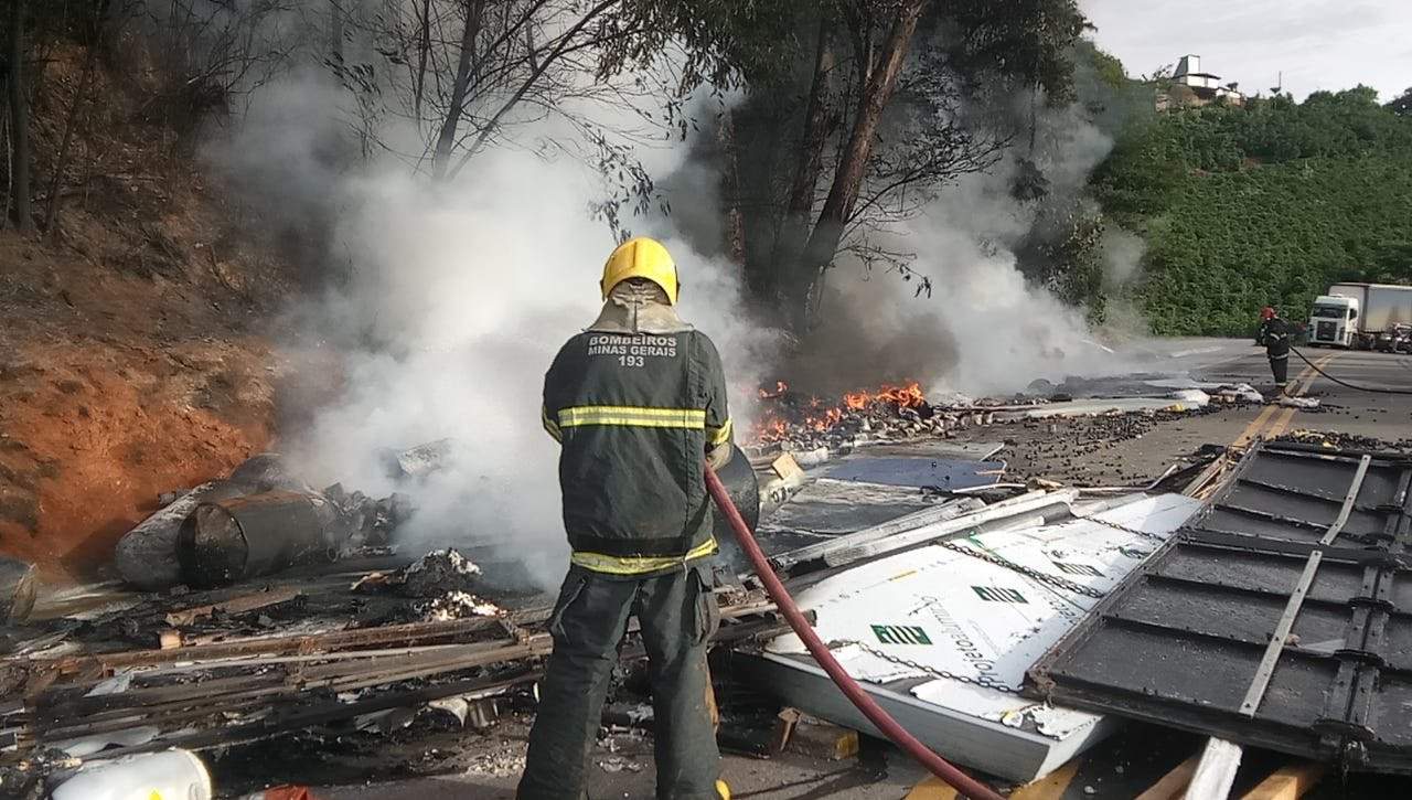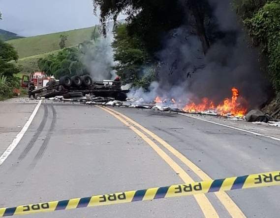 SÃO PEDRO DO AVAÍ / MANHUAÇU (MG) - Uma longa fila de veículos se formou na tarde desta terça-feira, 06/02, no km 578 da BR 116, onde uma carreta carregada de produtos diversos, entres eles, plásticos, tintas, produtos químicos e tóxicos tombou na pista e pegou fogo.