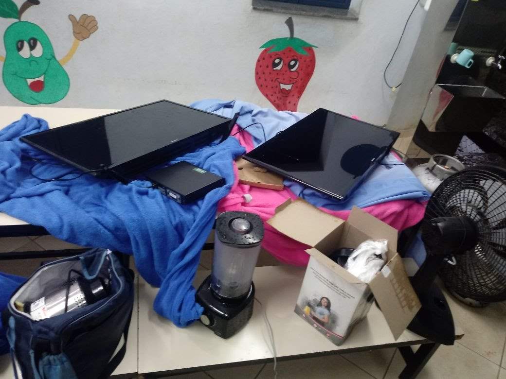 Foram recuperadas duas televisões de LED, quatro botijas de gás, ventilador, processadores e liquidificadores, ferro de passar roupas e um aparelho de DVD.