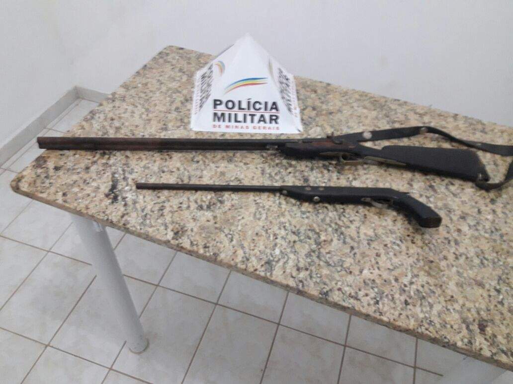 As armas de fogo também foram apreendidas com o auxilio dos estagiários do CFSD/2017. Uma espingarda e uma garrucha foram recolhidas pela PM em uma residência do bairro Colina em Santana do Manhuaçu. O autor foi preso.