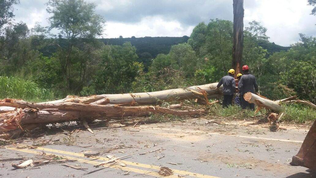 MANHUAÇU (MG): Na manhã desta quinta-feira, dia 08/02, O Corpo de Bombeiros Militar de Manhuaçu, foi informado por uma moradora próximo ao local que escutou estalos de uma árvore, eucalipto de grande porte que havia quebrado e caiu sobre outra árvore também de grande porte e que poderia vir a cair sobre a BR 116, km 573, em Vila de Fátima, onde havia um grande movimento de veículos.