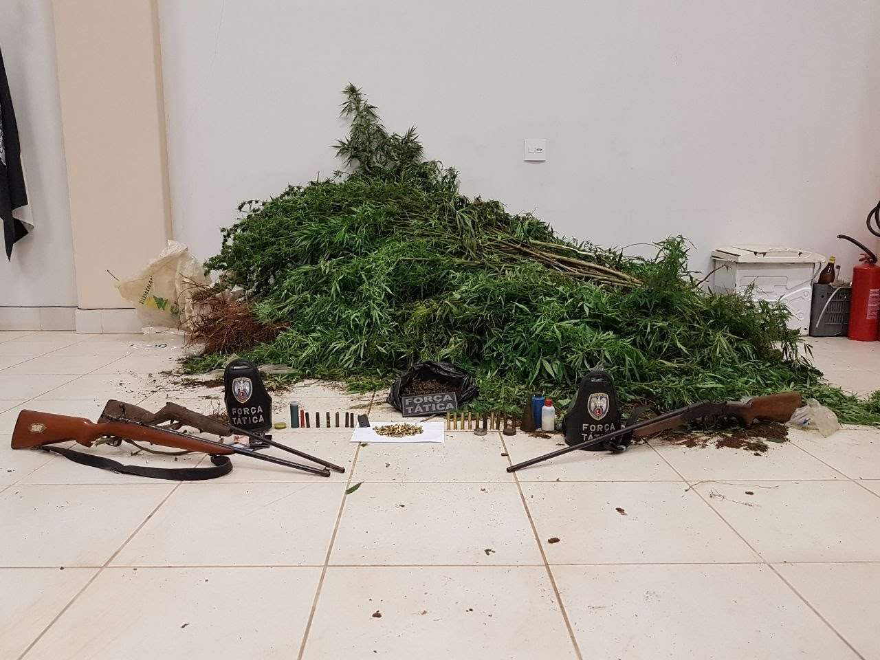 O primeiro homem confirmou as informações da denúncia e, na propriedade onde reside, foram encontrados 173 pés de maconha, um rifle calibre .22; 01 espingarda calibre .38; 162 munições 22; 01 carregador metálico tipo cofre calibre .22; aproximadamente 250 gramas de maconha preparadas para venda além de outros objetos.