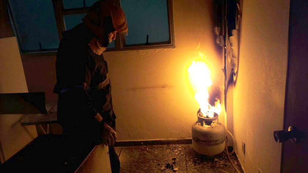 Os Bombeiros foram até o local com uma viatura alto bomba e constataram o princípio de incêndio. De imediato, o incêndio foi debelado e o botijão foi colocado para fora da residência, descartando a hipótese de explosão e isolando todo o risco.