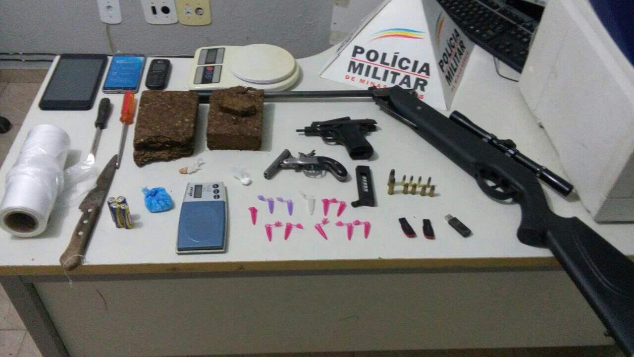 No local denunciado, os policiais encontraram uma espingarda de pressão, uma mochila de cor azul com uma barra de maconha de tamanho considerável (dividida em duas), diversas munições, papelotes de cocaína e crack, tubos para embalo de drogas, uma garrucha calibre 22, carregada e uma pistola calibre 7,65 carregada com quatro cartuchos intactos. Ainda foram localizadas sacolinhas de chup-chup e a caixa da balança de precisão apreendida primeiro.