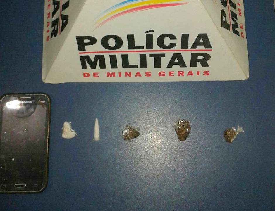 Os suspeitos foram alcançados e detidos. Durante busca pessoal foram encontrados um papelote e um pino de cocaína e ainda três buchas de maconha. Com o carona, que era menor de idade, nada de ilícito foi encontrado, mas em conversa com a mãe do adolescente ela afirmou que o filho está sempre acompanhado o autor que fornece drogas para ele.