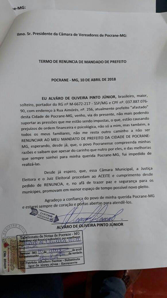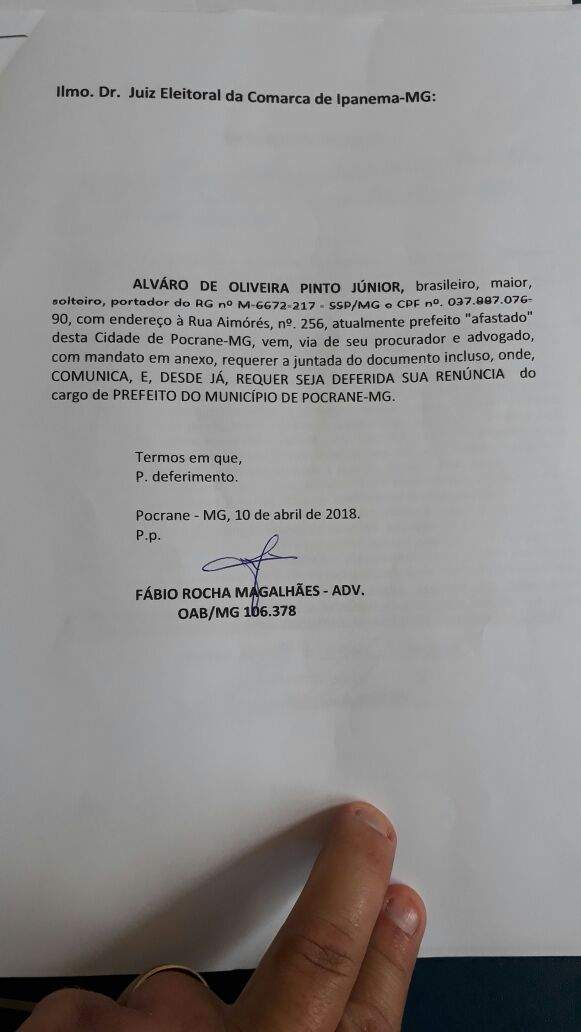 POCRANE (MG) - O prefeito afastado de Pocrane, Álvaro de Oliveira Pinto Júnior (PSB), “Juninho do Álvaro”, entregou nesta terça-feira (10/04) uma carta de renúncia para a Câmara de Vereadores e deixou o cargo. No pedido, Juninho do Álvaro, alega não mais suportar as pressões que lhe estão sendo impostas e causando prejuízos de ordem financeira e psicológica, não só a ele, mas também a todos os familiares dele.