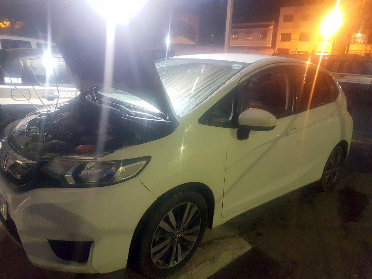 O automóvel se trata de um Honda/Fit, 2014/2015, cor branca, placa PVH-5991, licenciado em Uberlândia (MG), que foi avistado pelos Investigadores de Polícia estacionado na rua com sinais característicos de adulteração.