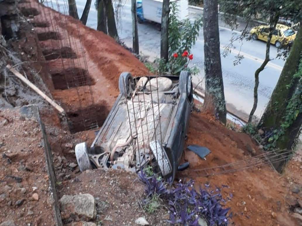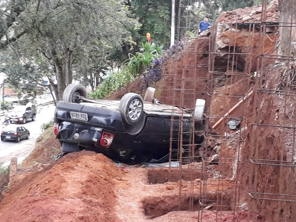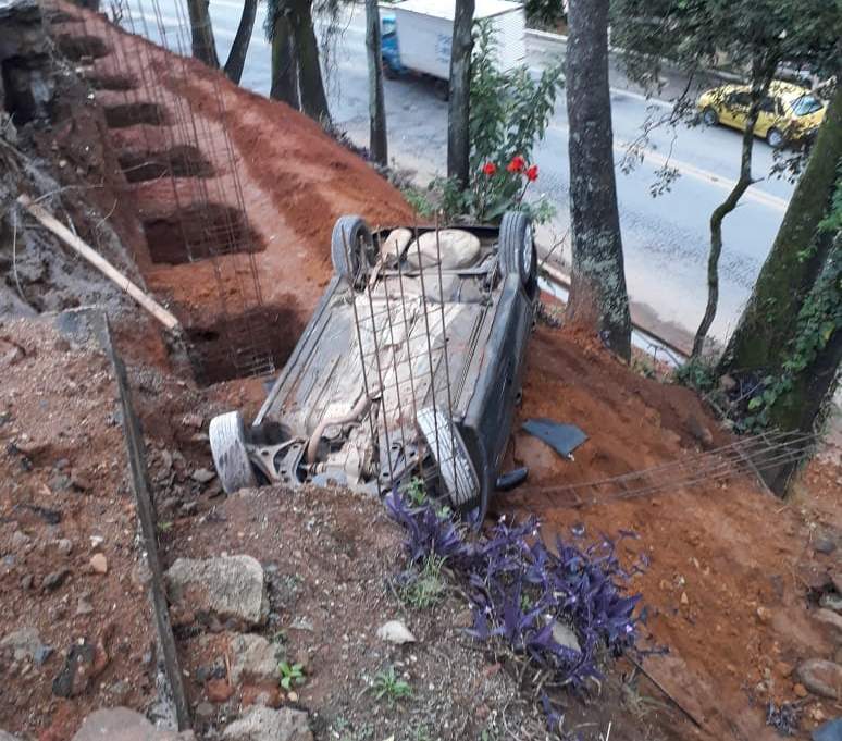 O veículo parou tombado com as rodas para cima no muro que está sendo reconstruído em frente ao cemitério municipal.