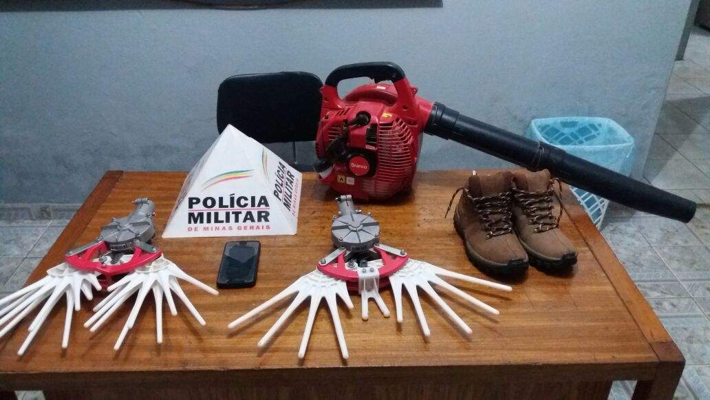 Foram recuperadas duas mãos derriçadeiras de café novas; um celular moto G de cor preta; um soprador novo; e um par de botas novas.