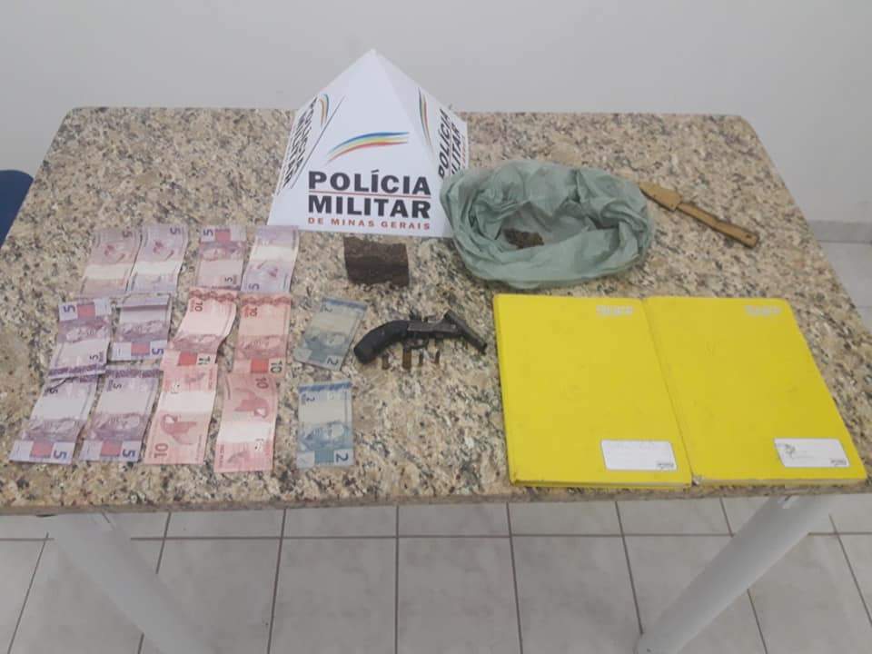 Após abordar o denunciado, os policiais apreenderam uma garrucha e quatro munições calibres 22, 32 e 44. Durante as buscas no imóvel, os militares encontraram uma barra de maconha dentro de uma sacola plástica, dois cadernos contendo várias anotações com quantia de valores variados com vários nomes de indivíduos, 84 reais em cédulas diversas e uma pequena porção de maconha esfarelada.