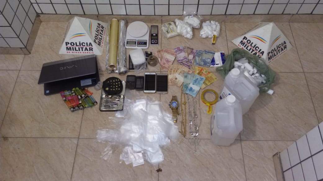 No total, a PM apreendeu oito cigarros de maconha (fracionados), dezessete pedras de crack (mais alguns resquícios), quatro celulares, duas balanças de precisão, um notebook, 38 isqueiros, um pacote de bicarbonato, dois galões de álcool de cereais, variados frascos de conta gotas para armazenar (Loló), várias sacolas de sacolé para dolagem de entorpecentes, um rolo de papel alumínio, um rolo de papel filme, três cordões prateados, um cordão dourado, duas pulseiras, um relógio dourado, um rolo de fita adesiva e 1.613 reais em cédulas.