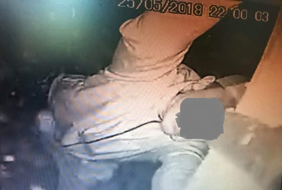 Ao verificar as câmeras, foi constatado que um jovem de cor clara, que usa aparelho nos dentes, com blusa de capuz, com boné e bermuda e com um anel grosso no dedo anelar da mão direita entrou na escola na data de 25/05, por volta das 22 horas, através do muro que está quebrado.