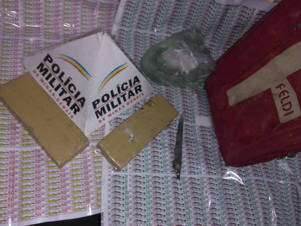 De posse dessas informações, a equipe da PM foi até o endereço denunciado e encontrou, em um cômodo nos fundos do porão, uma mala vermelha com resquícios de maconha. Depois, foram localizadas duas barras prensadas de maconha e uma sacola maior contendo inúmeras embalagens plásticas comumente utilizadas para dolagem de entorpecentes.