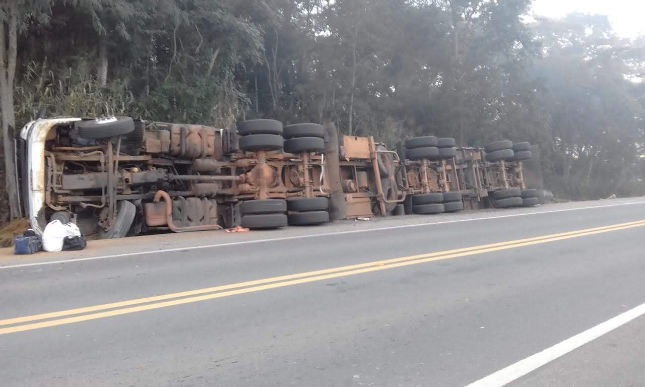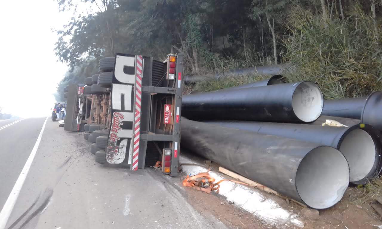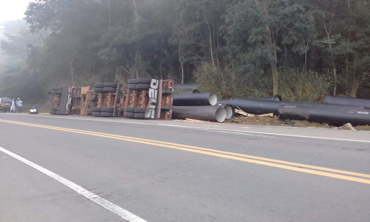 Uma carreta carregada com tubos de aço tombou no km 577 da BR-116, na zona rural de Manhuaçu.