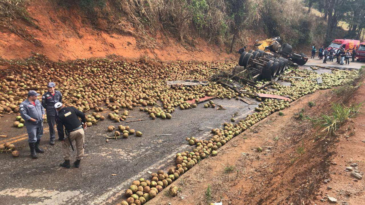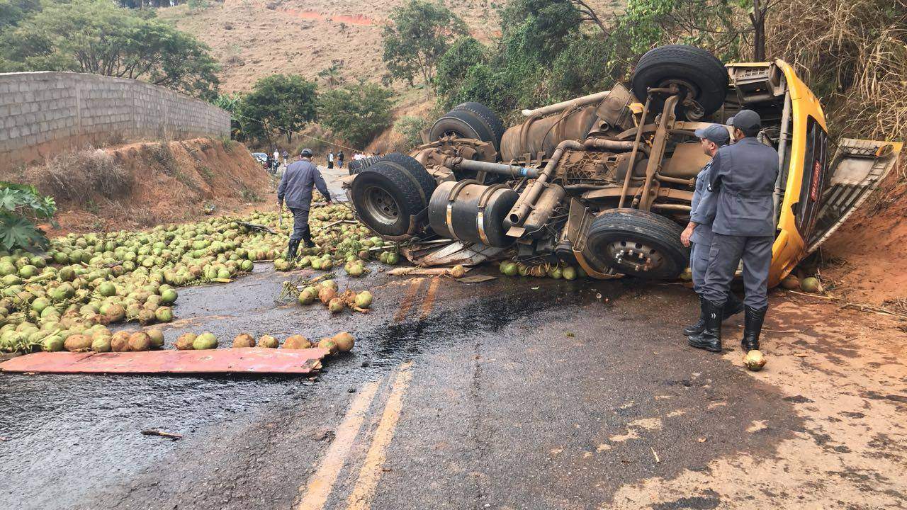 Um caminhão carregado de coco tombou na BR – 474, rodovia que liga Caratinga a Piedade de Caratinga. O Corpo de Bombeiros Militar confirmou dois óbitos no local, sendo as vítimas Josias da Silva e Silva, de 32 anos e Rogério Britto Cardoso, de 40 anos.
