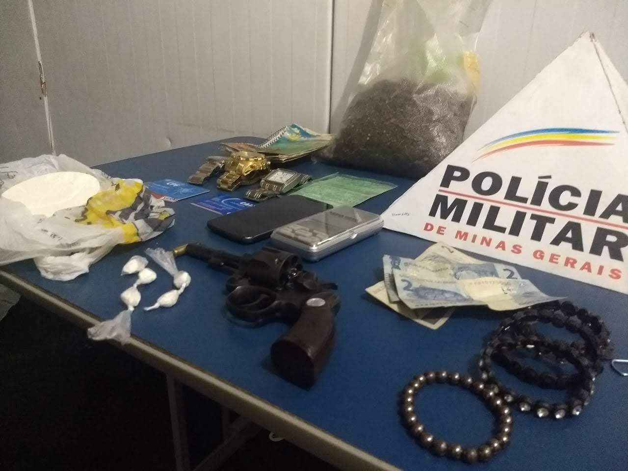 Na residência do casal foram localizadas uma sacola contendo, Skank (chamada supermaconha), um revólver calibre 32 e cinco papelotes de cocaína.