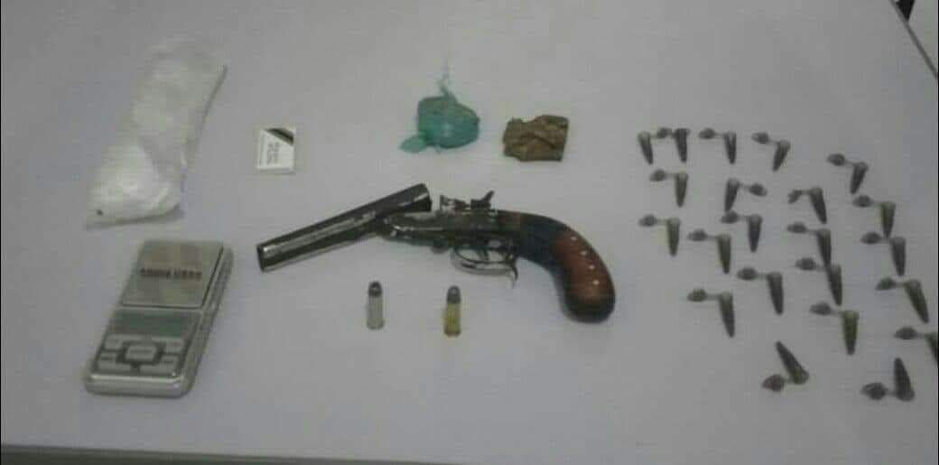 Os militares fizeram uma busca na casa onde foram encontrados 03 tabletes de maconha, 22 de cocaína, balança de precisão e diversas sacolas de chup-chup geralmente utilizada para endolar drogas, 02 cartuchos intactos para calibre .38, estando um deles picotado e uma garrucha, calibre .38 sem numeração.