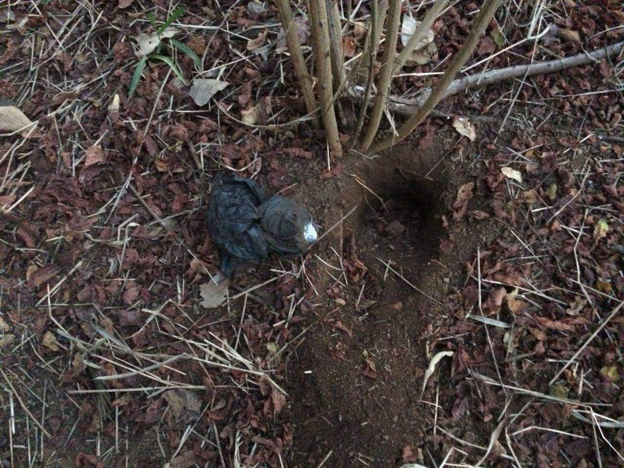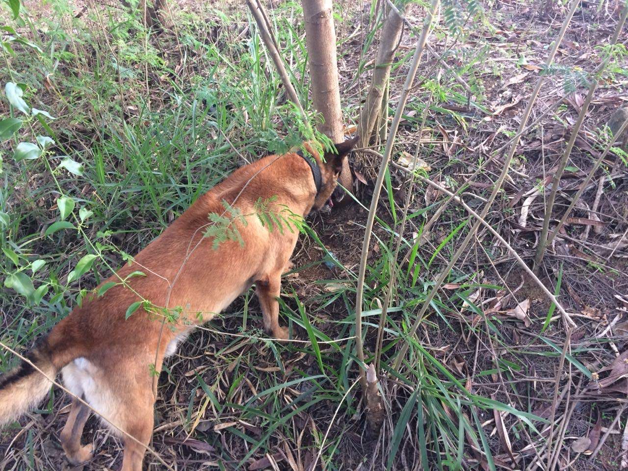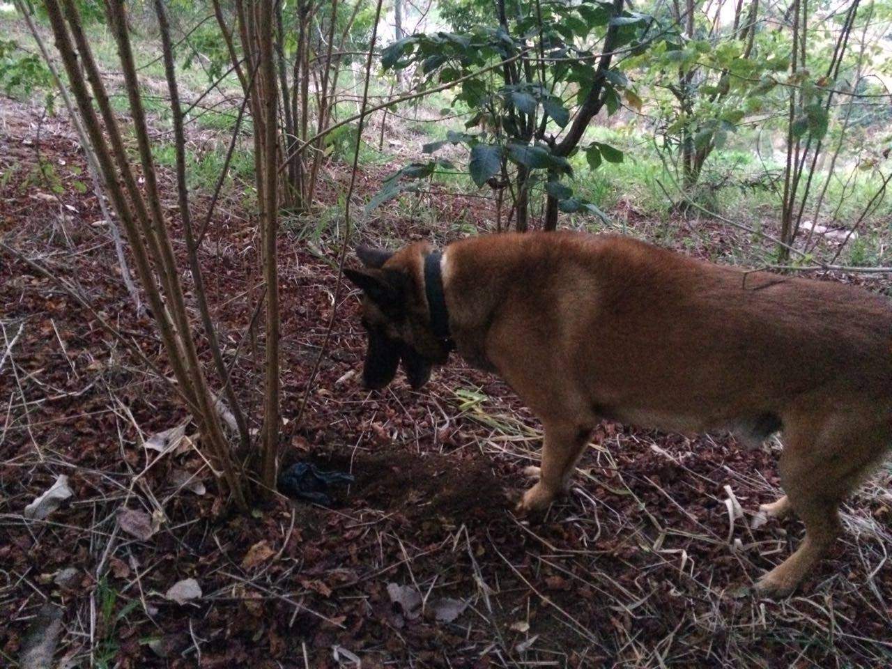 O cão de faro localizou as drogas em quatro pontos distintos, enterrado, aproximadamente 50 centímetros abaixo da superfície da terra.