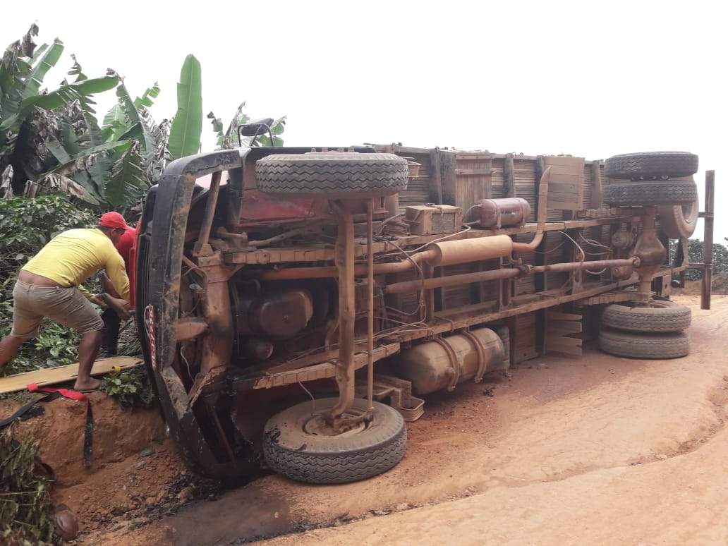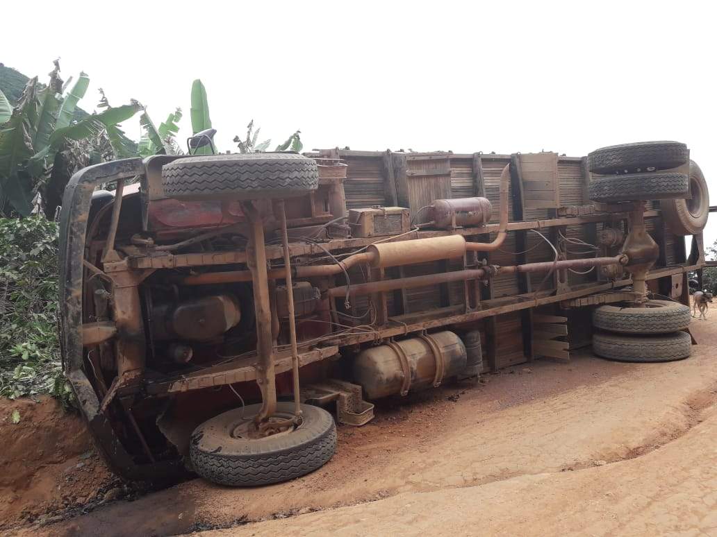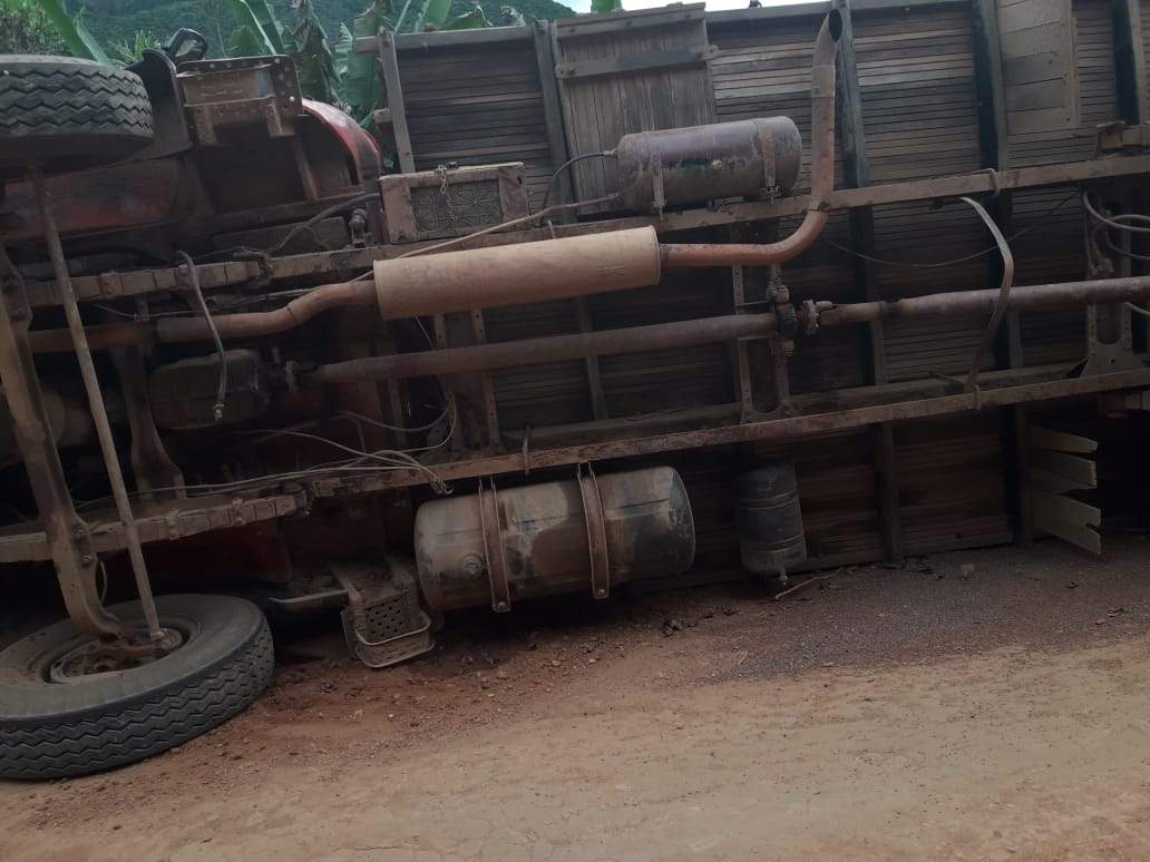 SIMONÉSIA (MG) - Um caminhão tombou no trecho da serra do Córrego Três Barras, zona rural de Simonésia, nesta segunda-feira, 27/08.