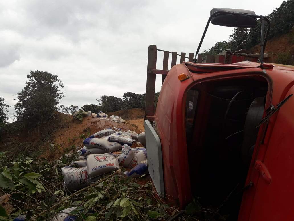 Durante a tarde, os Bombeiros Civis de Simonésia foram chamados por populares relatando o acidente. O caminhão carregado com adubos havia tombado.