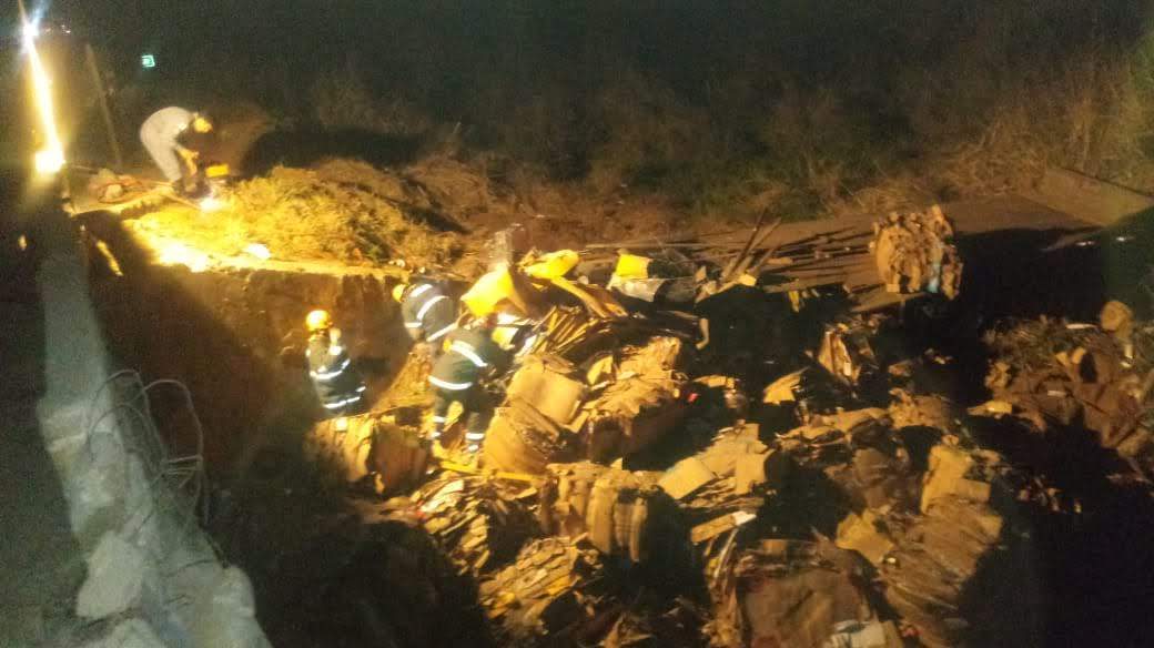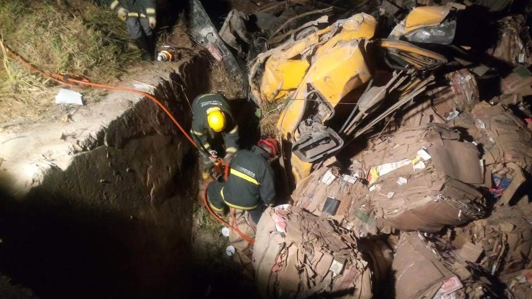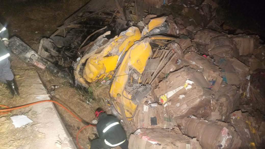 Com o impacto, o condutor morreu preso nas ferragens da cabine junto a fardos de papelão.