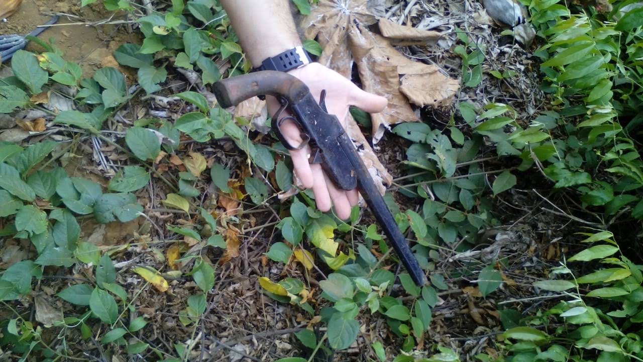 A arma foi localizada pelos militares escondida enterrada em um buraco, coberto com galhos de árvore e folhas secas. Autor de 38 anos foi encaminhado para a Delegacia de Polícia Civil.