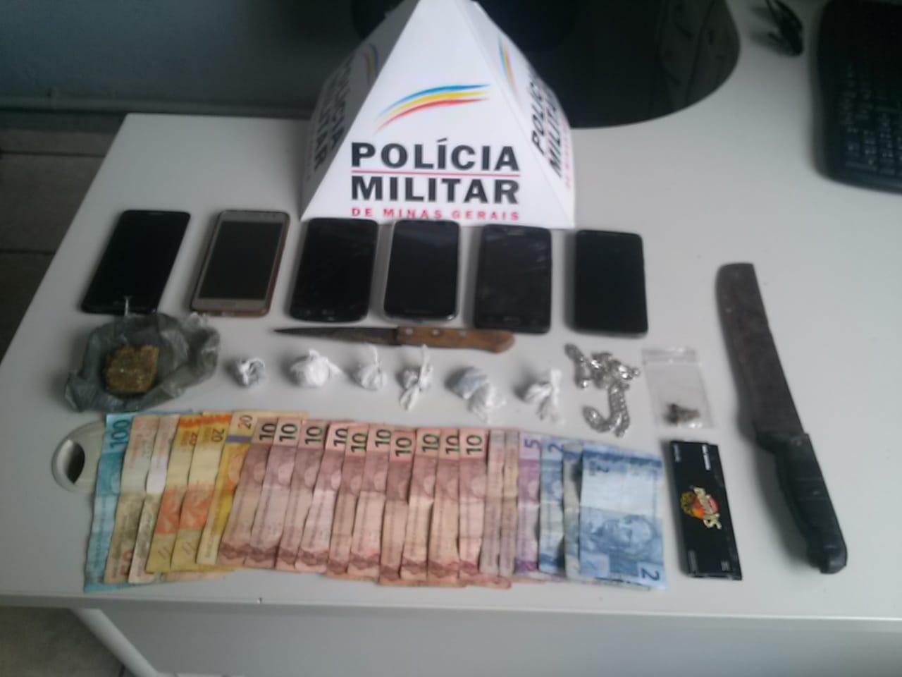 Foram apreendidos um tablete, seis buchas e duas guimbas de maconha; R$ 381,00, seis celulares; um cordão de prata; uma cartela de papel seda e duas facas.