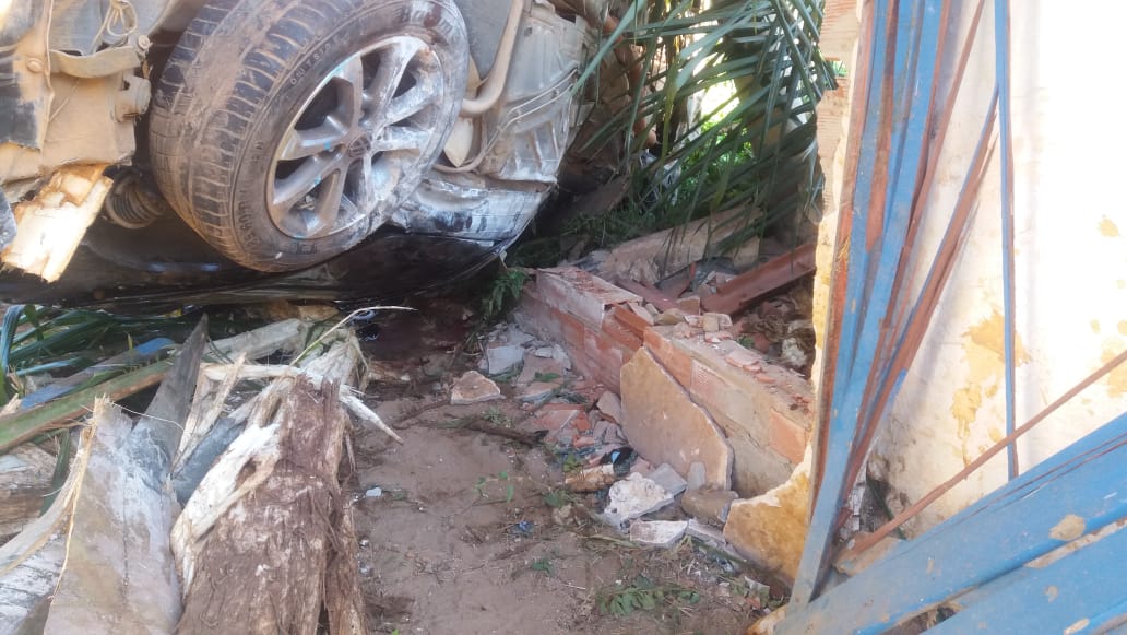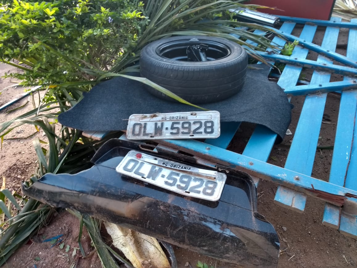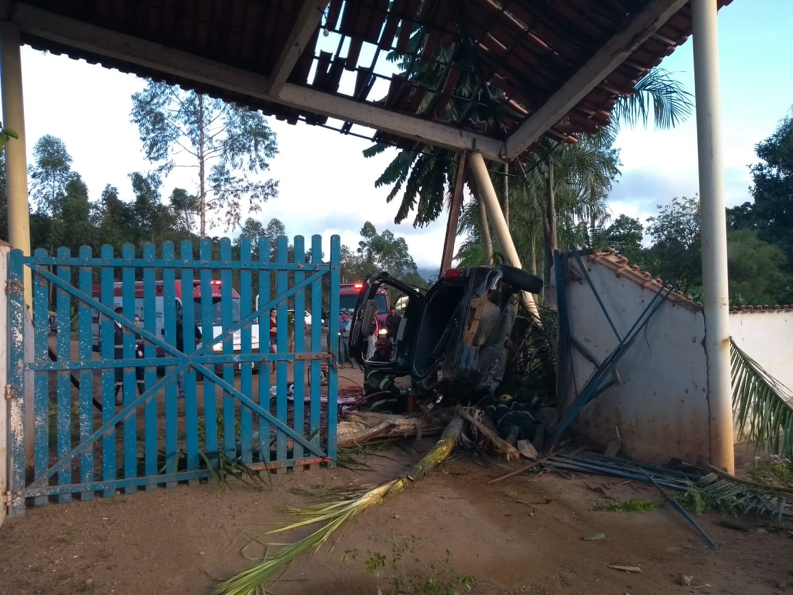 O condutor de um veículo Gol, com placas de Orizânia (MG), perdeu o controle direcional em uma curva, capotou e só parou ao bater na estrutura de um portal de entrada de uma fazenda.