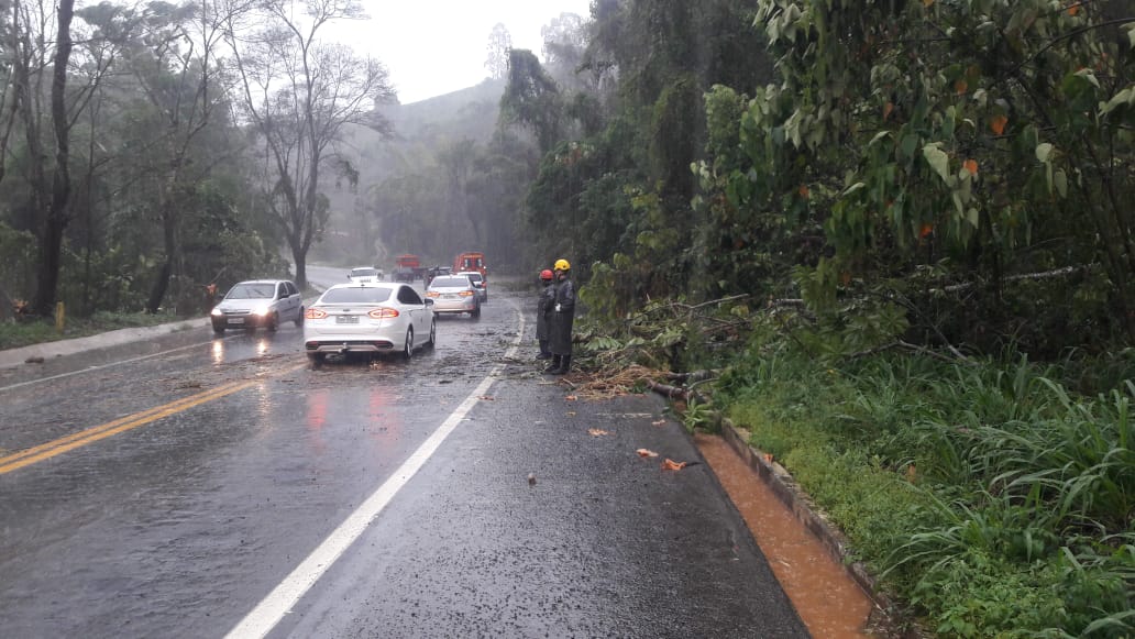 MANHUAÇU (MG) - Devido às fortes chuvas, acompanhadas de rajadas de ventos, no final de semana, o Corpo de Bombeiros de Manhuaçu atendeu várias ocorrências relacionadas a queda de árvores, principalmente na BR-262 até Realeza.