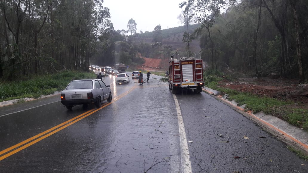O Corpo de Bombeiros Militar teve que fazer o corte de várias árvores que caíram na rodovia evitando o risco de novos acidentes.
