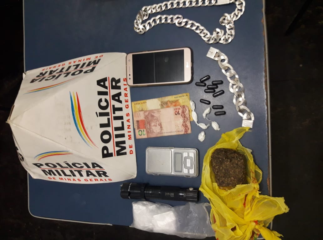 Segundo a PM, ao ser questionado, o jovem contou que correu dos policiais porque estava com um tablete de maconha e dezesseis porções de cocaína, que teria adquirido os entorpecentes de uma pessoa desconhecida pelo valor de R$540,00 no Campo de Avião.