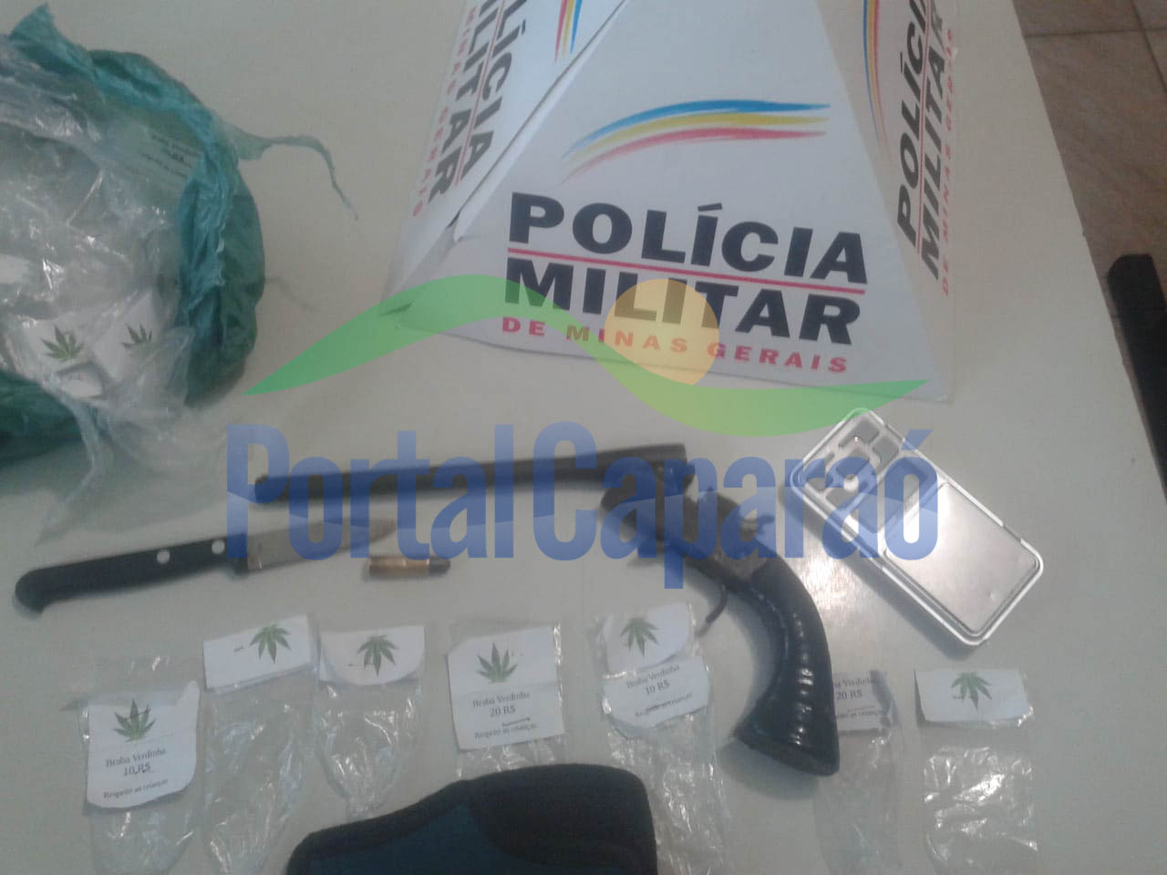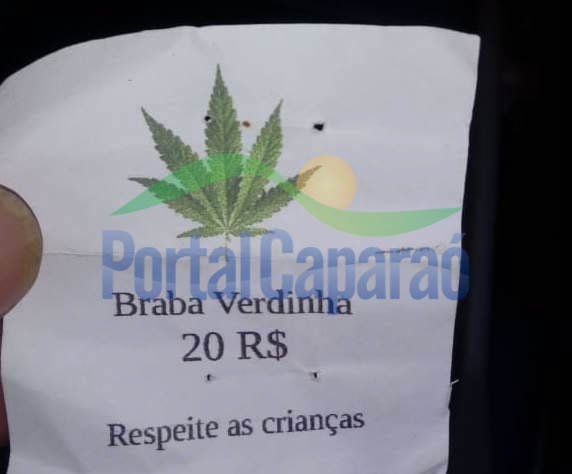 Na sequência dos levantamentos, policiais foram até as casas do menor. Na primeira, foi encontrado um papelote de cocaína. Na segunda, foram encontradas sacolinhas de chup-chup com os dizeres "Braba Verdinha Respeita as crianças!”, contendo os valores de R$20,00 (vinte reais) e R$10,00 (dez reais) estampadas atrás de um desenho da folha da planta da maconha. Ainda foram apreendidas uma balança de precisão, uma faca e um coldre.
