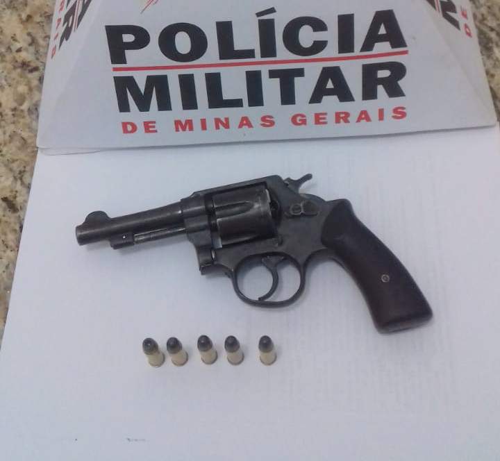Foi realizada busca pessoal e foi localizado, na sua cintura, um revólver calibre 32, carregado com cinco munições.