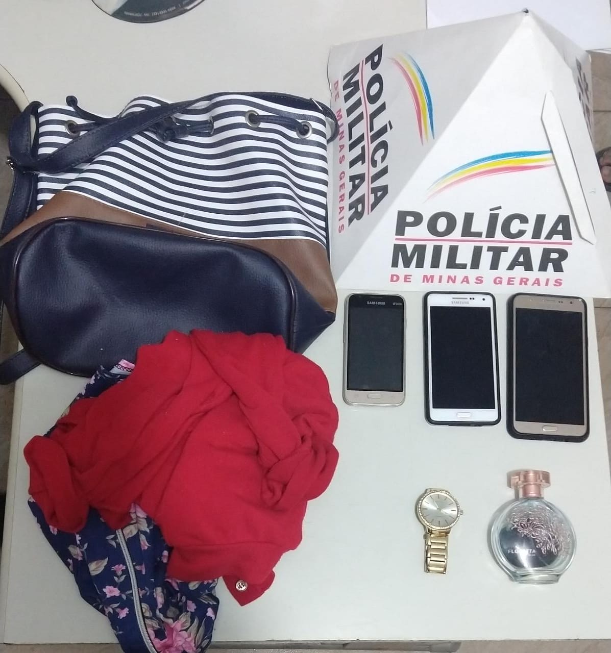 As demais vítimas foram acionadas e reconheceram os materiais roubados recuperados: três aparelhos celulares, um relógio de pulso, uma colônia, duas blusas e uma bolsa. Autores foram conduzidos para a delegacia de Polícia Civil.