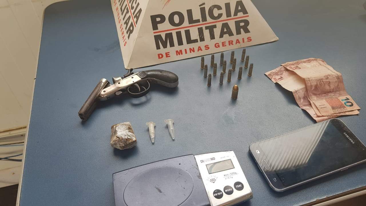O garoto de 14 anos carregava uma mochila com uma garrucha calibre 22; 16 cartuchos intactos; um celular, uma balança de precisão; uma bucha de maconha; dois pinos de cocaína e trinta reais.
