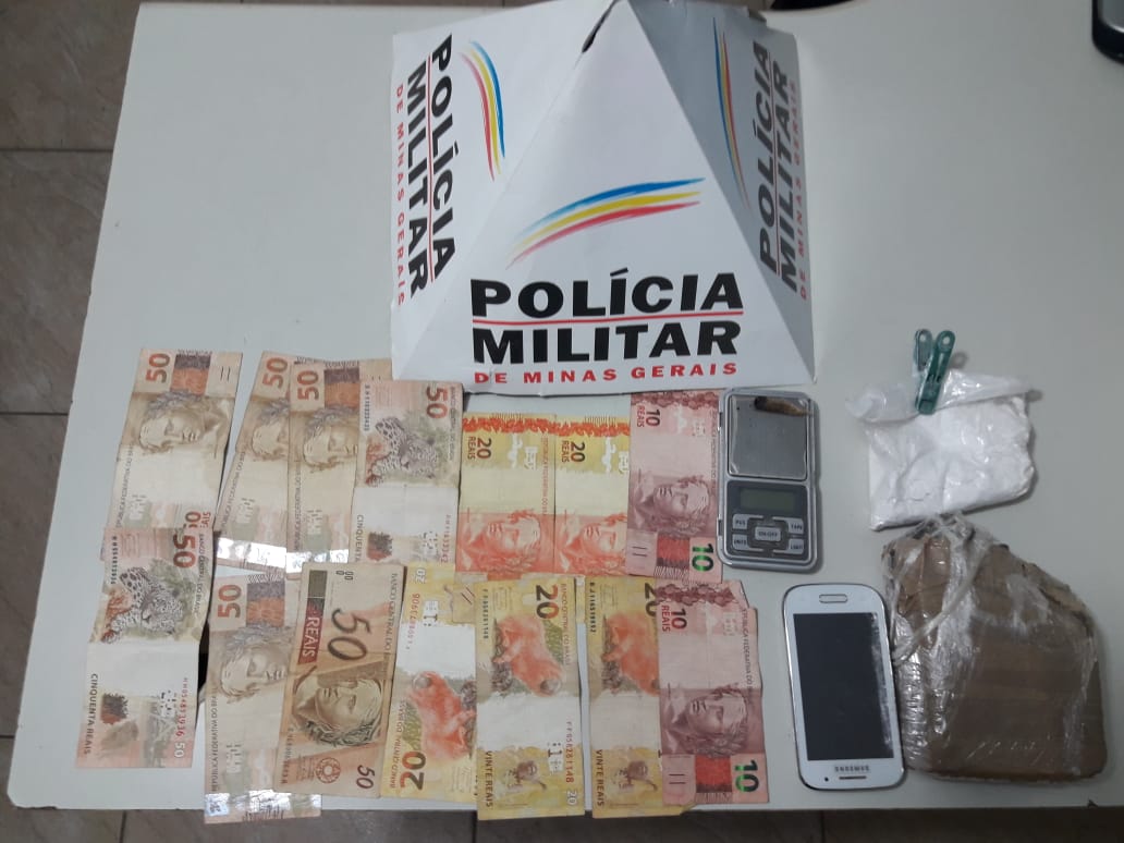 Na casa do jovem, uma barra prensada de maconha foi localizada dentro da geladeira. No quarto, havia uma sacola com cocaína e uma quantia de R$470,00. Dentro da perna tubular da mesa foi apreendida uma balança de precisão.